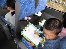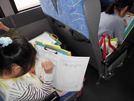 新聞の記者のインタビューに答えている児童です。今度は移動のバスのなかで、見学したことをメモでまとめます。