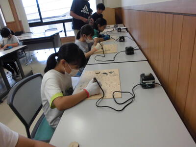入浴後、夕食をとりました。そして、貝殻キーホルダー制作をしました。自然の家の先生から作り方の説明を聞き、集中して取り組んでいました。世界に一つだけのキーホルダーが出来上がりました。