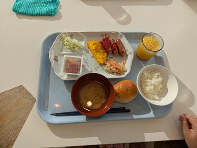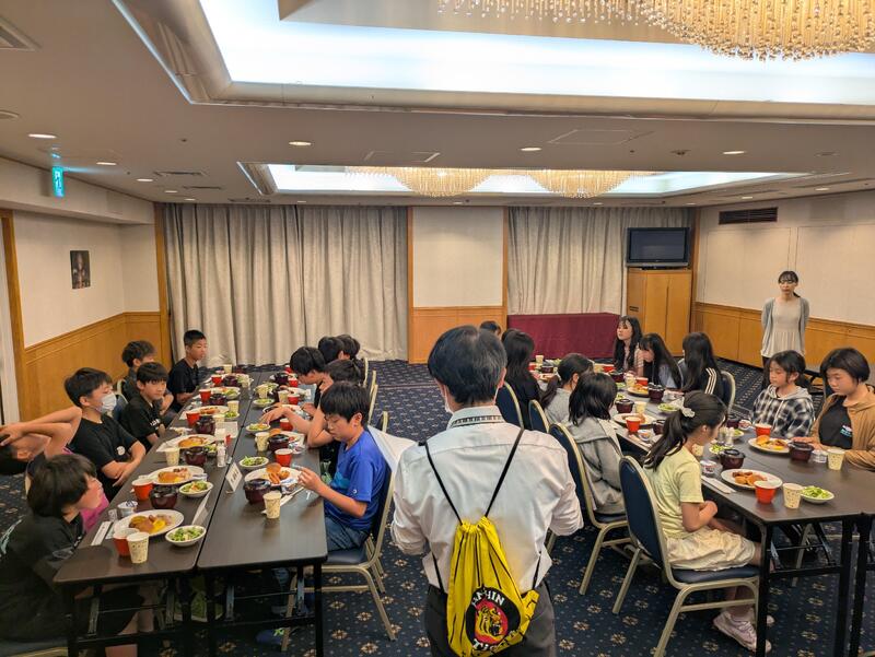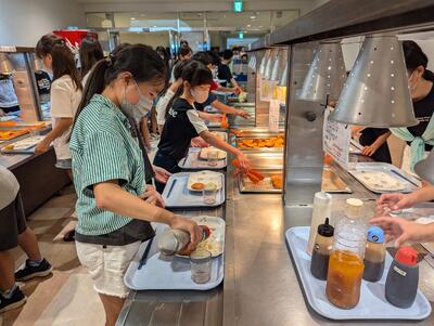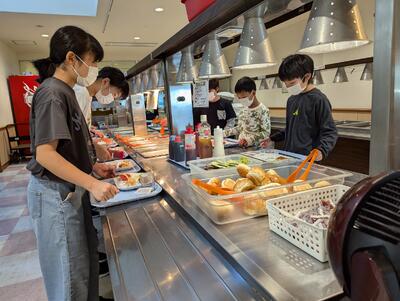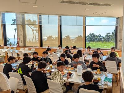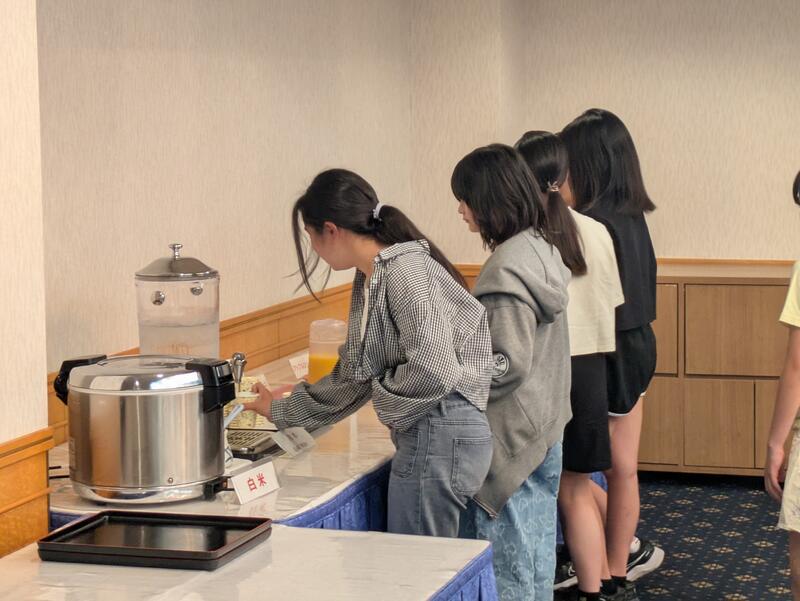 バイキング形式の食事にも慣れ、それぞれに考えながら朝食をとっていました。この後、部屋の清掃や荷物の片づけなどをして、塩づくりの活動に備えます。