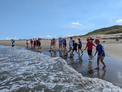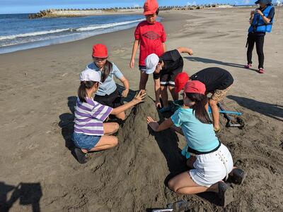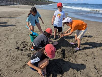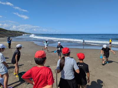 午後の一つ目は、砂浜での活動でした。波と追いかけっこ・ひしゃくリレー・砂山作り・砂の造形を行いました。どの班も協力し合って楽しく活動することができました。めあてをしっかりと守って、活動を楽しんでいる子どもたちです。
