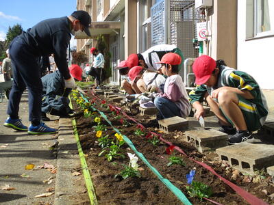 全校生が、縦割り班ごとに花壇の整備を行いました。パンジーとチューリップの球根を植えました。すっかり冬の花壇になりました。