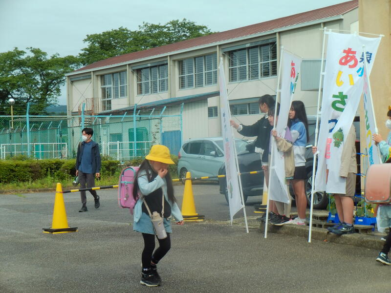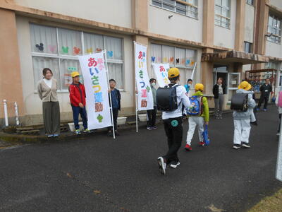 昨日に続き、朝のあいさつ運動ですが、今日は、6年生の女子がボランティアとしてあいさつに参加してくれました。