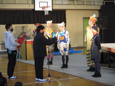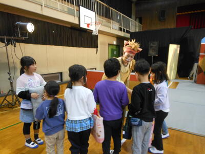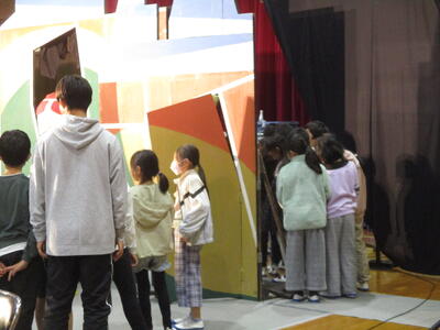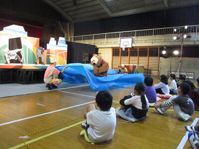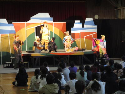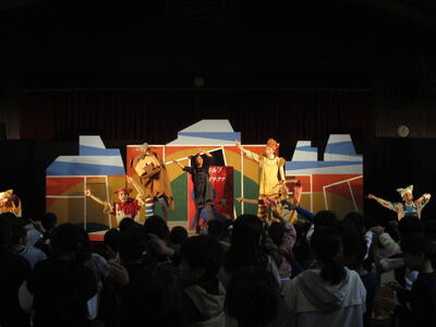 演劇鑑賞会を開きました。文化庁の舞台芸術等総合支援事業によるもので、「劇団たんぽぽ」による舞台劇「ルドルフとイッパイアッテナ」を鑑賞しました。劇団員さんたちの熱演と素晴らしい演出で、心に残る物語が展開されました。終演後には、舞台裏を見学させてもらったり、握手をしてもらったりして、感動が一層深いものになりました。