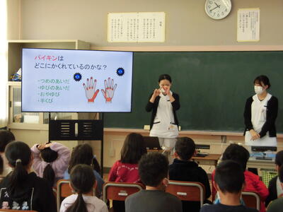 1年生、2年生を対象として、手洗い教室を行いました。塩谷病院の看護師さんが、上手な手の洗い方を丁寧に教えてくださいました。手洗いの習慣を身につけて、健康な体をつくっていってほしいと思います。