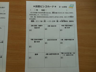 11月18日(月)~29日(金)の期間を読書月間として、図書イベントを実施しています。今回は、読み聞かせ、読書ビンゴ、ビックブックの展示、職員へのインタビュー、ともなりライブラリー読書、図書委員のポスター掲示など、内容が盛りだくさんです。中でも、読書ビンゴは大人気で、読書の幅を広げることにつながっています。学校全体で、読書の推進に取り組んでいます。