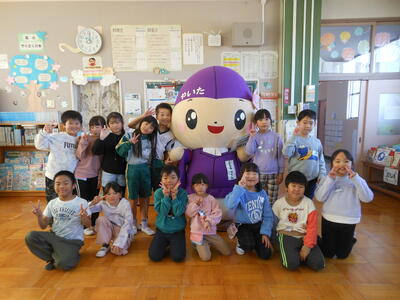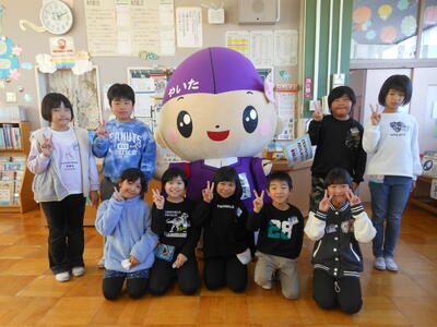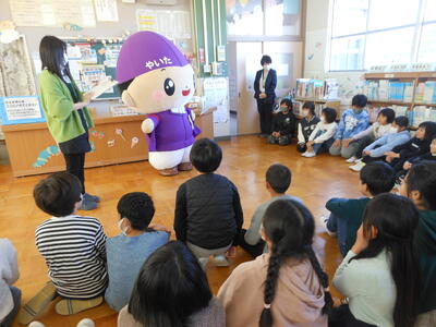 「ともなりライブラリー」の読書推進イベントのPRのために、ともなりくんが、来校しました。図書の係の先生からイベントについてお話を聞き、ともなりくんと一緒に記念撮影。みんなが笑顔になるひと時でした。
