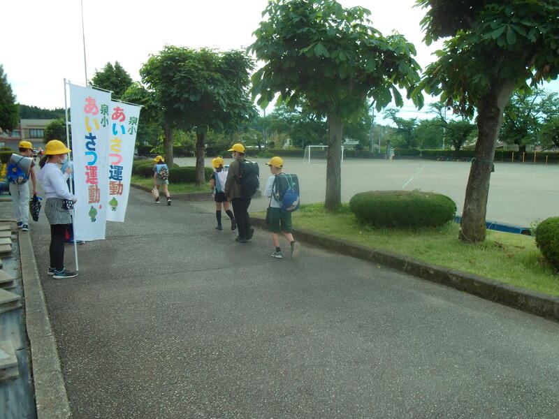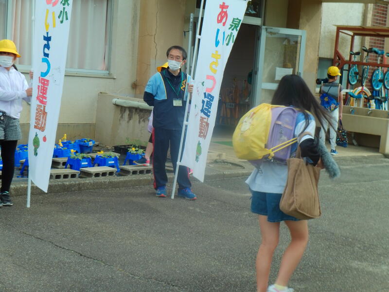 今週は、企画委員会による「あいさつ運動」が始まりました。委員の子供たちは、登り旗をもち先頭に立ちあいさつをしています。今年度は「子ども主役」という言葉で、委員会活動に取り組んでいますが、まさに、泉小をリードしてくれていてとても素晴らしいです。