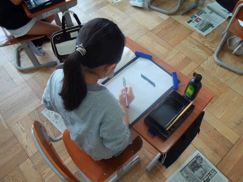 3年生の習字の授業では「二」の字の練習をしています。一筆一筆丁寧に書いています。