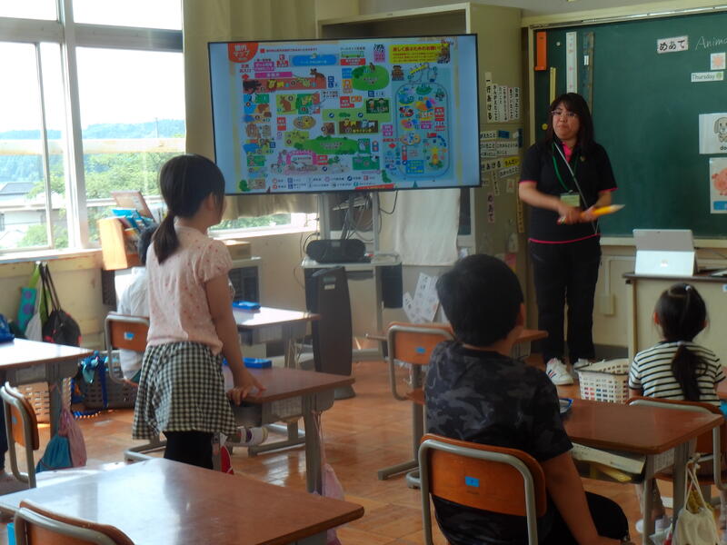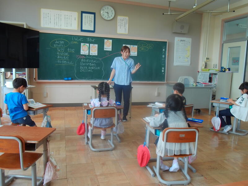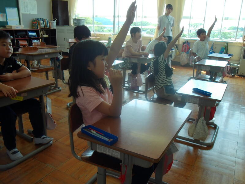 2年生は外国語活動を行っています。みんな発表したくて、手を挙げています。真っすぐにピーンと挙げています。