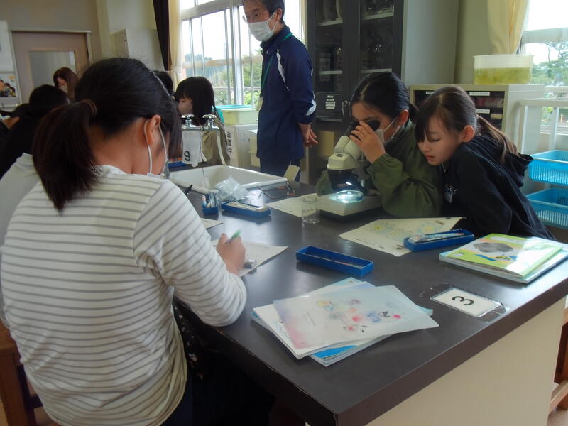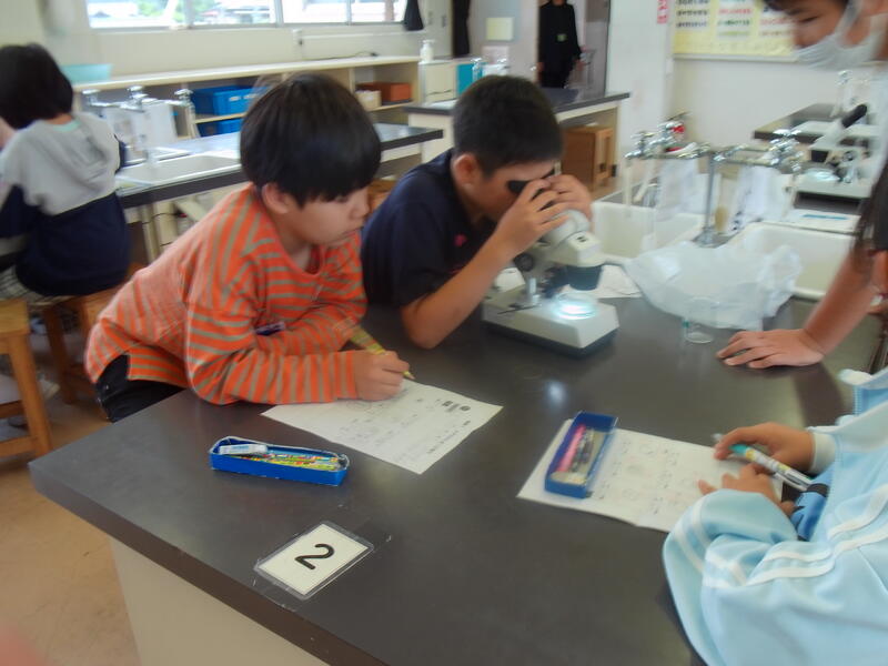 5年生の理科の実験です。顕微鏡を使い、上手にメダカの卵の観察をしています。