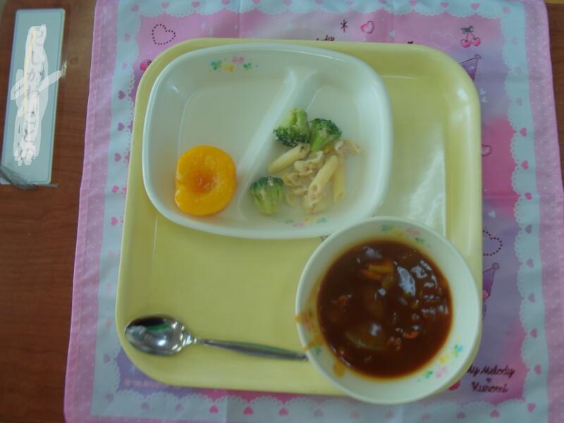 今日のメニューは、ハヤシライス、はなやさいとパスタサラダ、おうとう、ぎゅうにゅうでした。