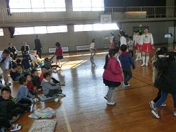 カラーガードのお姉さんたちが子供たちを誘っています。