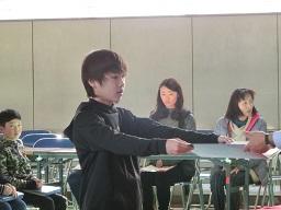 コンピュータ画面に映る自分たちのスピーチを聞いています。