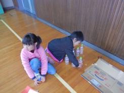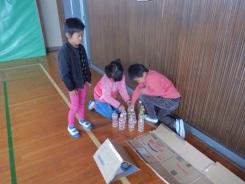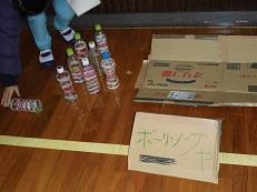 ここはボウリング場です。ペットボトルに水を入れてピンにしました。