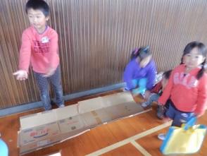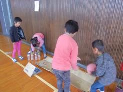 段ボールでコースを作りました。ピンに当てやすいですね。ドッジボールを転がしてピンを倒します。
