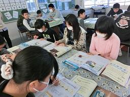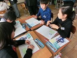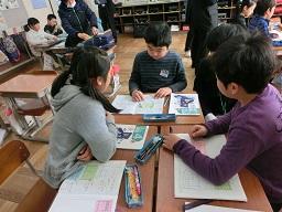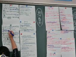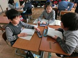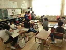 自分の考えが書けた人は手を挙げて先生に見てもらいます。いよいよ、グループになって考えます。