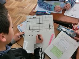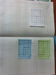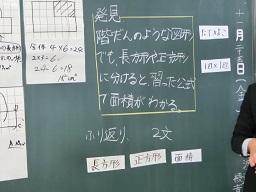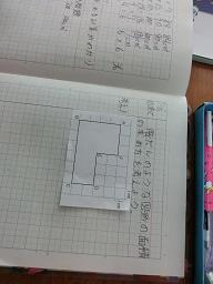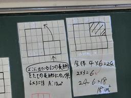 今日はこの形の面積を求めます。めあては子ども達と先生が話し合って「階段のような図形の面積の求め方を考えよう」となりました。