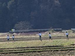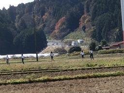 ここは4チームがだんごになって走っています。そしてえのきの方をまわり、帰って来て次の人にたすきが渡ります。