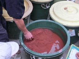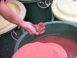 手ですくうと、細かいどろどろの赤い土でした。これを塗るんだと分かりました。次に土で造った乾かしたお皿を焼く窯を見せてもらいました。