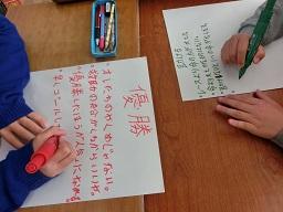 子供たちはグループになって「優勝したい」という気持ちと、「助けたい」という気持ちの理由を話し合って、1枚ずつ紙に描いていきます。