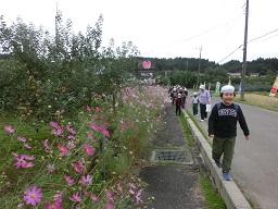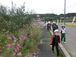 すっかり秋です。コスモスがきれい咲いています。2年生、1年生が楽しそうに歩いています。
