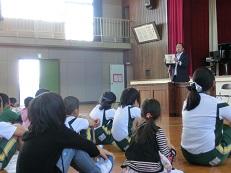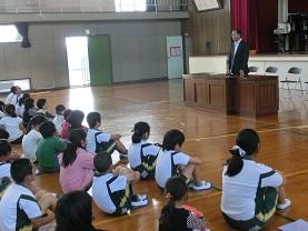 子供たちの代表の作文発表の後は、学校長の話です。今回はノーベル賞を受賞した大隅良典さんの話題を取り上げました。頑張ることと自分の好きなことをとことんやることを話しました。
