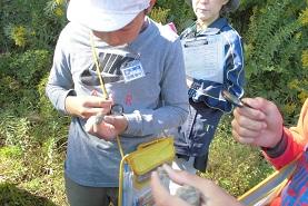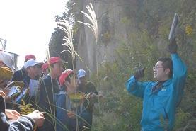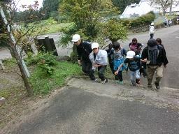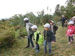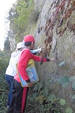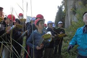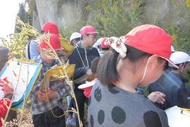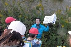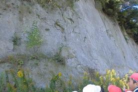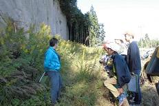 子供たちは崖を手で触って見ました。秋の草の実(ヨウシュヤマゴボウ)が見られますね。