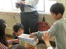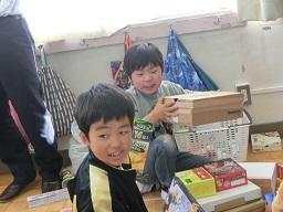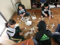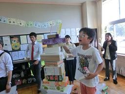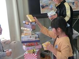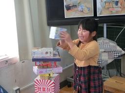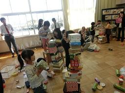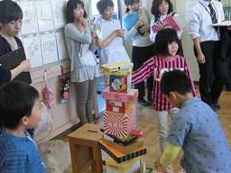 紙の箱をどれだけ高く積めるかをやっています。このグループはとっても高くなりました。椅子に乗りましたね。