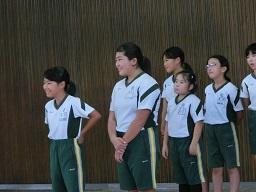 最後の頃、集合して先生の話を聞く時間でした。この日は試合ではなく練習をしていました。一番多くラリーが続いたグループを先生が紹介している場面です。みんないい顔をしていますね。