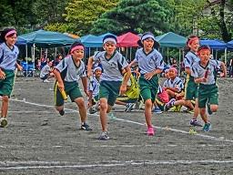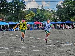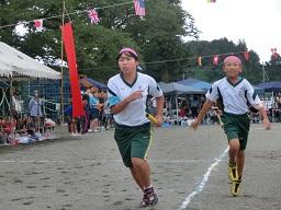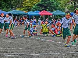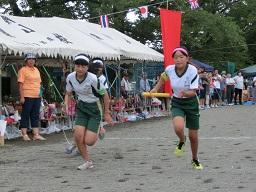 運動会の紅白リレーの続きです。バトンは5年生女子に渡っています。ORさんが緑で頑張っています。すぐ後ろを追っているのは赤組です。