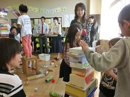 この、グループは高く積んだタワーが倒れて、もう一度やり直しです。