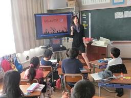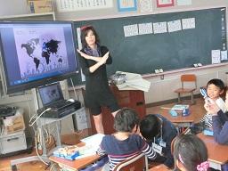 世界地図がテレビに映し出されています。ALTの先生が手で×をやっていますが、「ハロウィンはアメリカではなくヨーロッパだよ。」と英語で言っているのです。