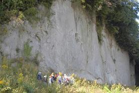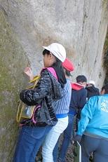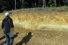 手で崖の土を削ってみました。市役所の方は持って来たハンマーで削ってくれました。