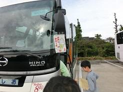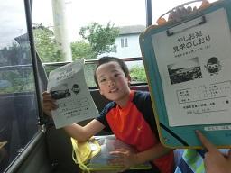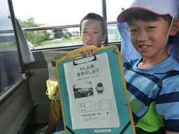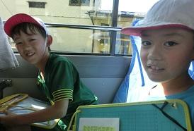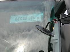 僕たちはバスに乗ります。「泉小学校」というプレートを見つけました。なぜかソフトクリームの小旗がかかっていました。