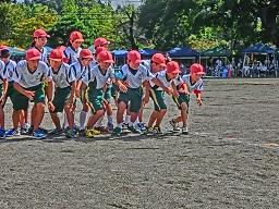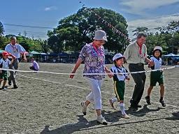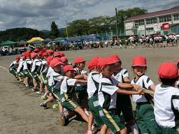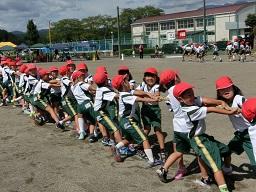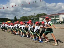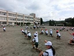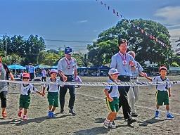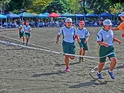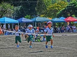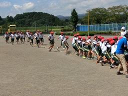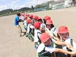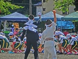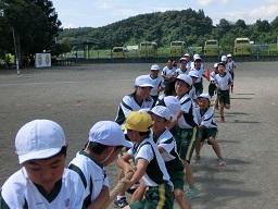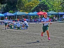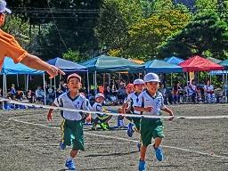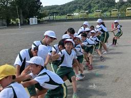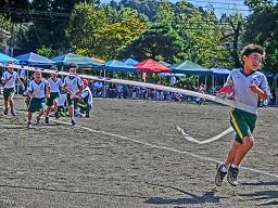 次は応援綱引きです。最初に1年生から4年生までが綱を引いています。同時に5年生と6年生は応援のため、トラックを走るスタートを切りました。