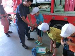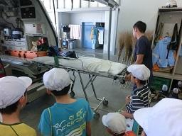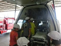 救急車に乗ってみました。物がいっぱいありました。寝台の入れ方や出し方も見せてもらいました。