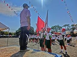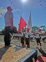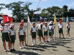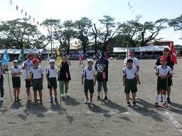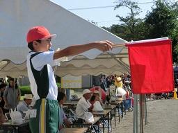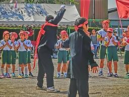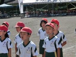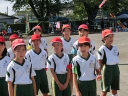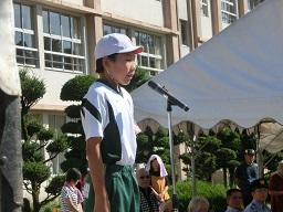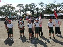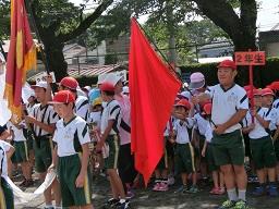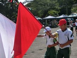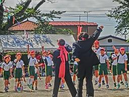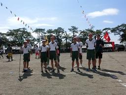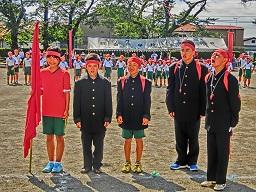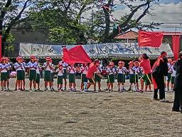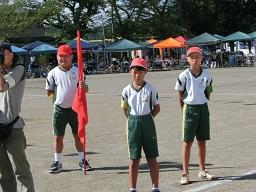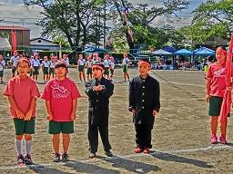 赤組の応援団長は、6年生のMK君です。副団長、5年生TT君、RO君の顔が見えます。