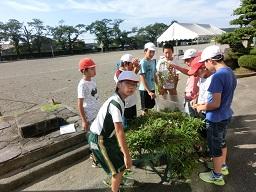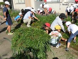 仲良し班で草を抜きます。夏休みの間にずいぶん草が伸びました。