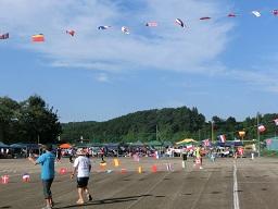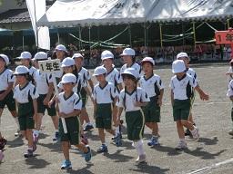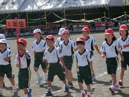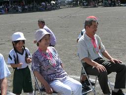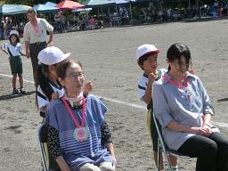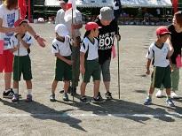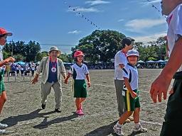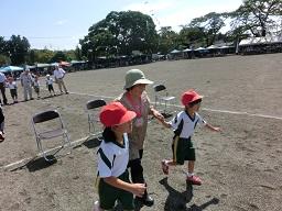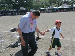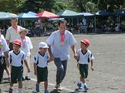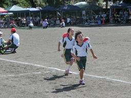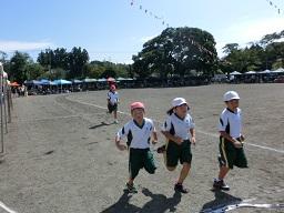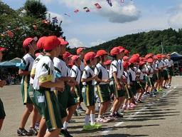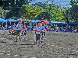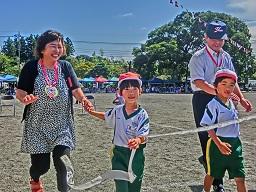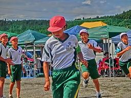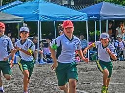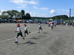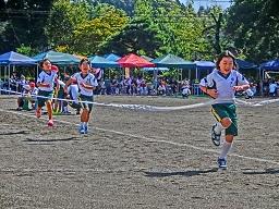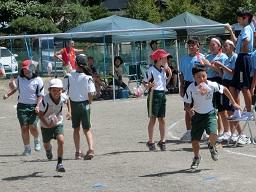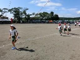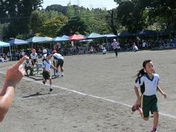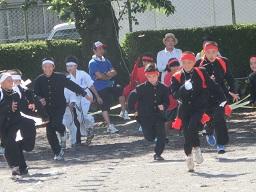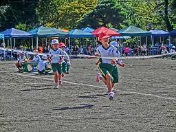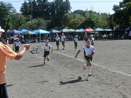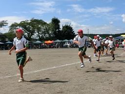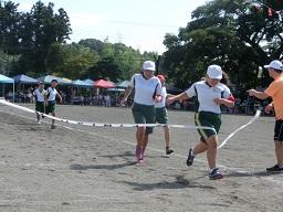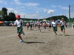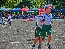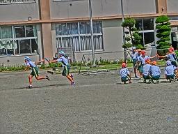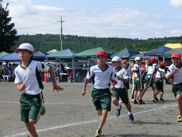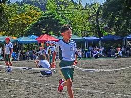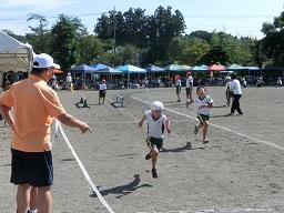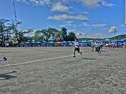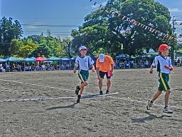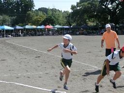 パン食い競走に出た、子供たちです。最初は6年生。野球部の練習着で出場しました。この後、スライディングでゴールしました。