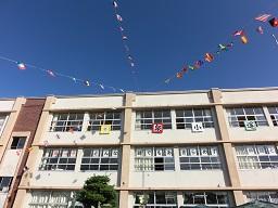 今日は台風のため臨時休校でした。学校では、明日からの準備に大忙しです。校舎2階の窓に今年の運動会のスローガンも掲示されました。
