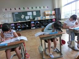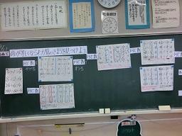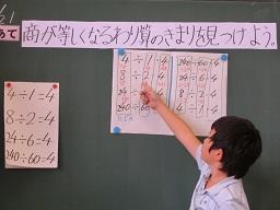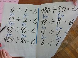 そして「割られる数を2倍すると、割る数も2ばいすれば答えはもとと変らない。」などと発表していきます。こいうきまりを自分たちで見つけることを炎ではいつも授業の中心において、勉強を進めています。