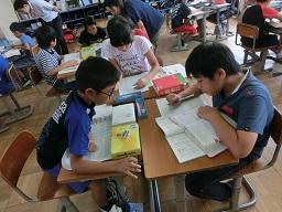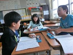 これらの写真は、子供たちがグループで話し合っている場面です。「商が等しくなるかけ算のきまりを見つけよう。」というめあてで勉強しています。