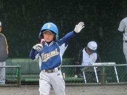 5回表に3点を許した直後、ベンチで監督が「絶対あきらめるな!」と気合いを注入しました。これが効いたのでしょう。その裏の攻撃は8番KH君がショートオーバーのヒット。続いてKT君も同じようにヒット。2番RO君もセカンドへヒット、3番KW君もセンター前にヒットです。4番RM君がフォアボールを選んで出塁。ここで5-5に追いついた泉クラブは、5番HW君が絶妙なバント。KW君、RM君がホームに戻って、2ランスクイズを決まりました。これで2点のリードです。その後、4年生SS君も出塁です。