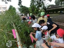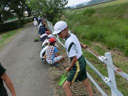 大勢で大江川の土手に向かいます。土手はすでにボランティアの方々によって草が刈られています。