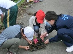 「ちゃんと植えられているかな?」 中学生と一緒に低学年の子が植えていますね。
