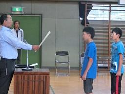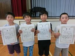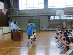 続いて市内陸上大会の表彰です。最初に、6年男子のYO君が、100mで2位、リレー1位の表彰です。次は5年男子のHW君が100で3位、リレー3位の表彰です。