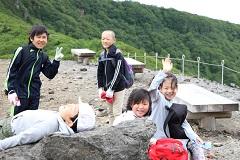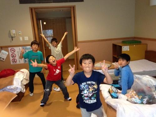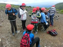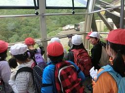 後ろの子が向こうを見ています。その視線の先は那須自然の家です。よく見えます。今日はここに泊まります。