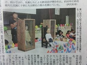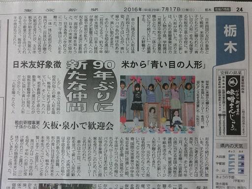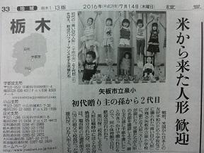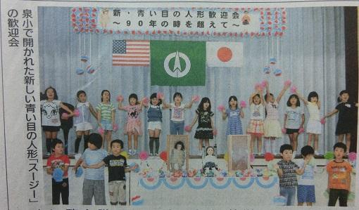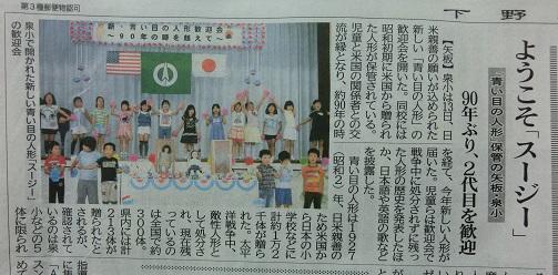 今日の下野新聞に、新・青い目の人形のことが掲載されました。青い目の人形の歴史、新・青い目の人形「スージー」の経緯、そしてスージーの歓迎会、平和教育としての位置づけ、と一連の流れが分かる文章です。スージーの歓迎会は、7月13日です。子供たちの出し物があります。どうぞお楽しみに。