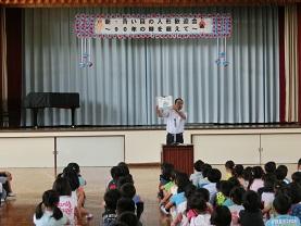 新しい青い目の人形「スージー」の時に、アメリカに手紙を書いた2年生の二人も校長室に来て、写真を撮りました。7月13日のスージー歓迎会についての取材でした。