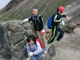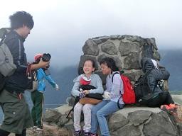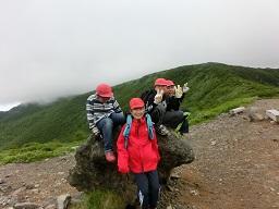 ここは那須岳(茶臼岳)へ登る分岐ポイントです。山はガスで見えません。ここで集合写真を撮りました。